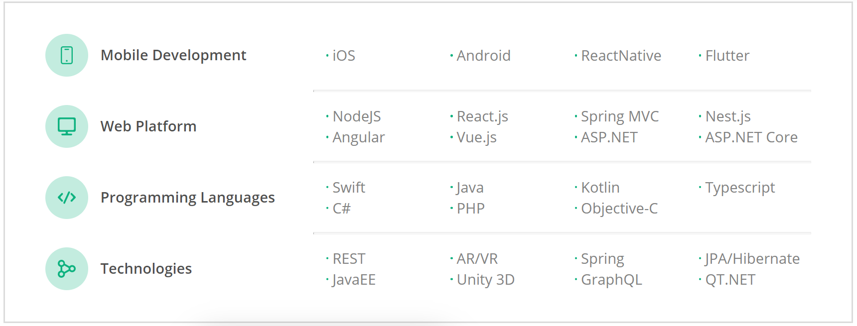 As an IT firm, we take the perspectives of our clients and their diverse claims in software development. To help you achieve your goals, we enhance our capacities by working with various programming languages, platforms, and new technologies. The list of what we can do is given below